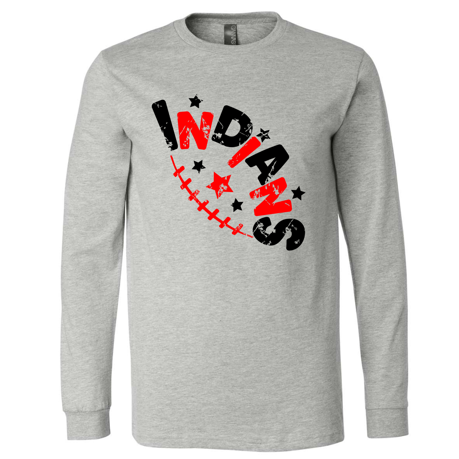 The INDIANS FOOTBALL LONG SLEEVE SHIRT is crafted from Bella Canvas CVC Jersey, offering a pre-shrunk fabric that ensures consistent fit wash after wash. Designed with a unisex cut, it provides a comfortable, versatile fit suitable for all. This tee combines durability and style, making it a reliable choice for everyday wear or team events.