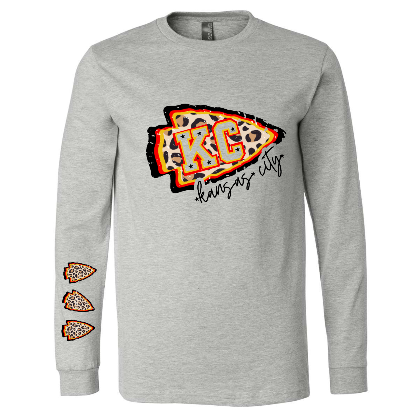 The CHIEFS LEOPARD LONG SLEEVE SHIRT is crafted from Bella Canvas CVC Jersey, offering a pre-shrunk fabric that ensures consistent fit wash after wash. Designed with a unisex cut, it provides a comfortable, versatile fit suitable for all. This tee combines durability and style, making it a reliable choice for everyday wear or team events.